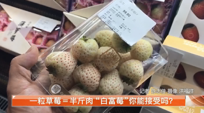 在蘇州(zhou)園(yuan)區的這家超(chao)市里,專柜(ju)上擺(bai)放著這(zhe)樣的白色,通體發白,帶著淡淡的粉(fen),看上去有點不尋常,更是賣到了(le)7塊錢(qian)一粒。而一旁,還有更貴的(de),這(zhe)盒草(cao)莓個頭(tou)稍大(da),11顆價(jia)格近100元,每顆草(cao)莓算下(xia)來(lai)要(yao)9塊錢(qian)。而這(zhe)些(xie)正(zheng)是最近紅遍(bian)朋友圈的(de)白色草(cao)莓,人稱“白富莓”。