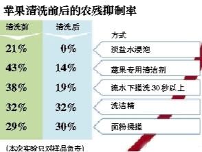實驗結果:實驗人員介紹,從本次實驗看,鹽水浸泡后再沖洗,蘋果的農殘抑制率直接從21%降為零,效果最明顯。其次是專門的果蔬清潔劑,去除農殘也還不錯。另外,流水下直接搓洗,也能在一定程度上幫助去除農殘。但選用洗潔精以及水中加入面粉揉搓,效果并不明顯。