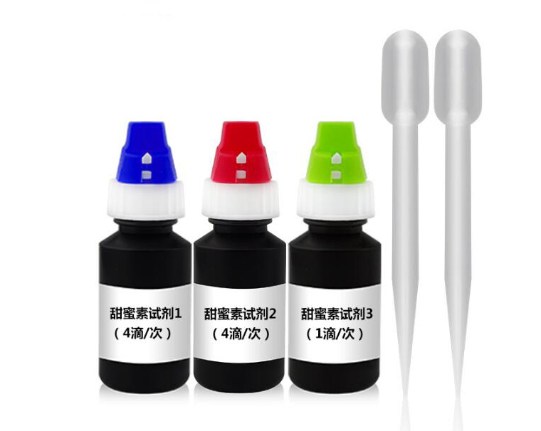 吸取 0.5ml 樣品于 10ml 比色管中,加入 1.5ml 蒸餾水(或純凈水),加入 4滴甜蜜素檢測試劑1、4滴甜蜜素檢測試劑2,搖勻比色管中的溶液,靜置片刻,接著滴加 1 滴甜蜜素檢測試劑 3,滴加后立即搖動 1 分鐘,在搖動的過程中將蓋上蓋子,放置2分鐘,搖勻后觀察溶液的渾濁度,與檢測色階卡進行比較,即可得到甜蜜素含量。