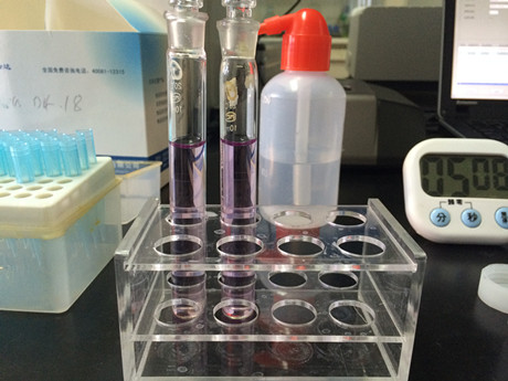 3、取一(yi)支10mL比色管,加入1mL樣品液,取一(yi)空(kong)白管內加入蒸(zheng)餾水替代樣品液,分別加入C溶液80μL,加蒸(zheng)餾水至10mL刻度線,加入D溶液0.5mL,搖勻,開蓋靜置10min。